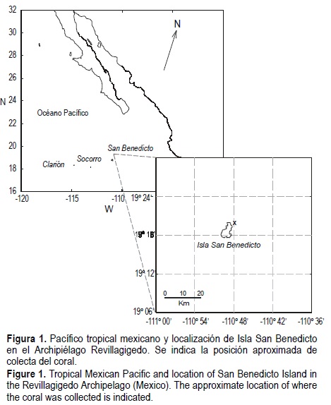Para este estudio se empleó un núcleo de coral Porites sp. colectado en junio de 1998 en Isla San Benedicto (núcleo SBII-10) (fig. 1). De acuerdo con el análisis radiográfico, el crecimiento promedio de este coral fue de ~8 mm año-1 y para este trabajo sólo consideramos los últimos 50 años de crecimiento. Se obtuvo una muestra cada 2 mm, siguiendo el eje de máximo crecimiento, que es una frecuencia suficiente para detectar la variabilidad estacional y proveer un registro climático confiable (Quinn et al., 1996; Crowley et al., 1999).