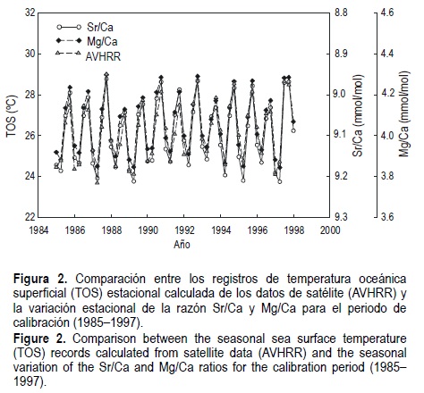 Las series de tiempo obtenidas a partir de las señales de Sr/Ca y Mg/Ca reproducen claramente los máximos y mínimos del ciclo estacional de la temperatura (fig. 2). La razón molar Sr/Ca varió estacionalmente entre 8.961 a 9.213 mmol mol-1 y, durante el periodo de calibración (1985-1997), mostró una alta covariación con la temperatura "local" derivada del satélite AVHRR (23.67-29.01°C). La ecuación de calibración Sr/Ca-TOS, calculada mediante una regresión lineal, muestra una relación negativa (fig. 3a) de la forma: