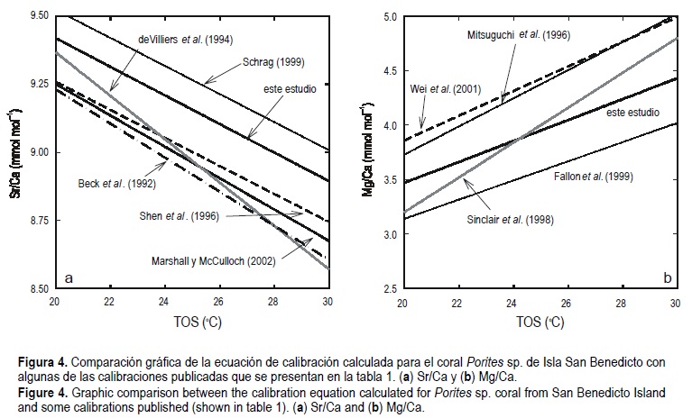 Al comparar la calibración Sr/Ca-TOS obtenida en este estudio con las publicadas para otras regiones, se encontró que la sensitividad térmica de esta ecuación (dada por la pendiente de la calibración) es muy similar a la calculada para Porites lutea de Islas Galápagos (Schrag, 1999), para corales del género Porites de Taiwán (Shen et al., 1996) y de la Gran Barrera Arrecifal en Australia (Alibert y McCulloch, 1997; Sinclair et al., 1998; Gagan et al., 1998; Fallon et al., 1999; Marshall y McCulloch, 2002). En contraste, las pendientes de las relaciones Sr/Ca-TOS obtenidas para P. lobata de Hawai (de Villiers et al., 1994) y P. lutea de Rarotonga (Linsley et al., 2000) son marcadamente mayores (tabla 1). La media de todas las pendientes incluidas en la comparación es de -0.0619 (±0.0087; 1σ) (tabla 1). No obstante la similitud en las pendientes de las ecuaciones de calibración (tabla 1, fig. 4a), al considerar una misma razón Sr/Ca la temperatura predicha por estas ecuaciones difiere significativamente entre las localidades estudiadas y esta diferencia puede llegar a ser hasta de ~6°C.