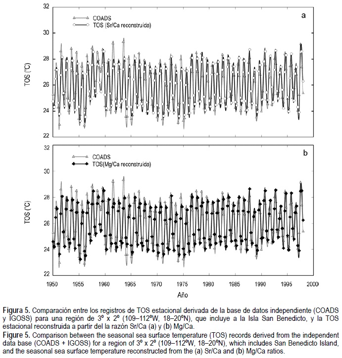 La temperatura reconstruida a partir de Sr/Ca y Mg/Ca fue validada al ser comparada con una base de datos independiente (Crowley et al., 1999). La TOS estacional empleada en la comparación fue generada a partir de la TOS mensual media de un cuadrante de 2° x 2° grados (110-112°W, 18-20°N), de la base de datos de COADS (resolución de 2° x 2° grados, disponible de manera discontinua de 1854 a 1992) (Slutz et al., 1985) y se complementó con la TOS mensual de la base de datos de IGOSS (resolución 1° 1°, disponible de 1981 a la fecha) (Reynolds et al., 2002). Para esta comparación, los datos de IGOSS de los cuatro cuadrantes fueron promediados para ajustarse a la resolución espacial de 2° x 2° de COADS.
