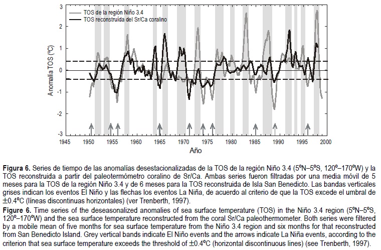 En la figura 6 se muestra la anomalía de TOS reconstruida con el paleotermómetro Sr/Ca, comparada con la anomalía térmica de la región ecuatorial Niño 3.4, considerada como un índice de la evolución de los eventos ENSO (e.g. Trenberth 1997, 2001). La elevada coherencia entre ambas señales muestra que los eventos de El Niño constituyen el forzamiento principal para la TOS en esta región a escala interanual (Baumgartner y Christensen, 1985; Trasviña et al., 1999), aunque la diferencia en amplitud entre ambas señales indica que en esta región oceánica transicional del Pacífico las anomalías térmicas generadas por El Niño son menos intensas.