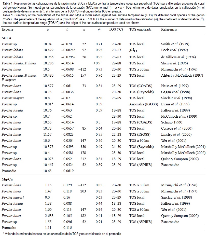 Para reconstruir la TOS a partir de los paleotermómetros de Sr/Ca y Mg/Ca generalmente las señales geoquímicas generadas se calibran con series cortas de temperatura obtenidas de registros instrumentales de sitios cercanos a la colecta (de Villiers et al., 1994; Mitsuguchi et al., 1996), con registros in situ (Alibert y McCulloch, 1997; Correge et al., 2000; Marshall y McCulloch, 2002), con las temperaturas derivadas de otros registros o estimaciones aproximados de temperatura (Beck et al., 1992) o a partir de bases de datos de temperatura oceánica superficial disponibles (Gagan et al., 1998; Crowley et al., 1999) (tabla 1). Este enfoque, aunque común, ha sido cuestionado debido a que inferir el comportamiento de la TOS reconstruida en escalas de tiempo largas, para una localidad determinada, requiere demostrar que la TOS derivada de los paleotermómetros se correlaciona con la TOS derivada de bases de datos independientes (Crowley et al., 1999).