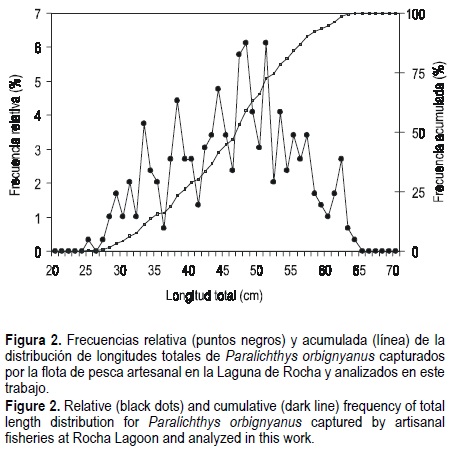 La selectividad de las redes usadas por los pescadores artesanales para capturar P. orbignyanus determinó la composición de longitudes analizada en este estudio. La frecuencia acumulada de la longitud total mostró que la red de enmalle retuvo principalmente individuos mayores de 38 cm. Teniendo en cuenta que la longitud de primera madurez del lenguado es de 26.9 cm para machos y de 38.5 cm para hembras (Mellito et al., 1995), la mayoría de las capturas fueron individuos adultos.