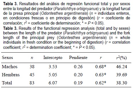 El 40.61% de los individuos analizados (n = 119), presentaron contenidos estomacales (tabla 1). La frecuencia acumulada de la longitud total al 25% y 50% de las tallas retenidas por la red fue de 38.7 cm y 46.5 cm, respectivamente (fig. 2). El índice de alimentación varió entre 0.20 y 0.59 (tabla 1). Los coeficientes de ocurrencia y numérico por presa se presentan en la tabla 1. Se identificó un total de 5 items alimenticios, en general relativamente frescos o en principio de digestión, en la dieta del lenguado: el pejerrey Odontesthes argentinensis (Valenciennes, 1835; Familia Atherinopsidae), la lacha Brevoortia aurea (Agassiz, 1829; Familia Clupeidae), la corvina blanca Micropogonias furnieri (Desmarest, 1823; Familia Scianidae), el lenguado Paralichthys orbignyanus (Valenciennes, 1842; Familia Paralichthyidae) y peces teleósteos no identificados (tabla 1). El pejerrey Odontesthes argentinensis fue la principal especie consumida por el lenguado, mientras que otros peces fueron presas esporádicas con bajos porcentajes de ocurrencia y número (tabla 1). El canibalismo fue menor al 3% del total de los items presa presentes en los estómagos (tabla 1) y ocurrió en las clases de talla de 46-56 cm (tabla 2). Se encontraron diferencias significativas (P < 0.05) entre las clases de talla para el total de las presas (test G = 32.12; X2 12; 005 = 21.03) y para O. argentinensis (test G = 27.55; X2 3, 0.05 = 7.81) (tabla 2). Se observaron correlaciones significativas (P < 0.05) y tendencias positivas entre la longitud furcal del pejerrey y la longitud total del lenguado por sexos, pero un bajo porcentaje de la variabilidad en el tamaño de la presa (<47%) es explicado por el tamaño del predador (tabla 3).