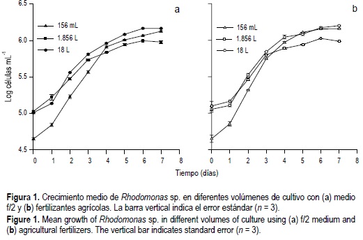 Rhodomonas sp. se obtuvo del cepario del Instituto de Investigaciones Oceanológicas de la Universidad Autónoma de Baja California (México). Esta cepa se mantuvo en cultivo a 20 ± 1°C de temperatura con medio f/2 (Guillard, 1975). El medio con fertilizantes agrícolas estuvo constituido por 882 µM de N-NH4NO3, 39.45 µM de P-P2O5, 15.51 µM de Fe-EDTA, 8.07 µM de MnSO4, 6.75 µM de ZnSO4, 13.92 µM de CuSO4, 0.5 µg L-1 de biotina, 0.5 µg L-1 de B12 y 0.1 mg L-1 de tiamina-HCl (Valenzuela-Espinoza et al., 1999). Para preparar los medios de cultivo, el agua de mar se filró a través de filtros tipo Cuno de 3 y 1 µm, y se irradió con un sistema de luz ultravioleta modelo H-50.