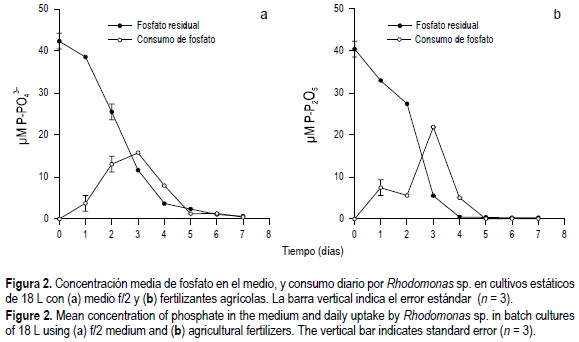 En ambos tratamientos se observó un rápido consumo de fosfato durante los primeros cuatro días, el cual se relaciona directamente con el incremento en la densidad celular. Al cuarto día, el consumo acumulado de fosfato en el medio f/2 fue de 38.6 µM (91.4%), restando 3.66 µM de fosfato residual (8.6%). Asimismo, el consumo acumulado de fosfato en el medio con fertilizantes agrícolas fue de 40 µM (98.9%), quedando sólo 0.41 µM (1.1%) de fosfato residual. Durante el resto del cultivo (fase de crecimiento lento), debido a la diferencia en la concentración residual del fosfato en el medio entre tratamientos, el consumo resultó ser mayor en el medio f/ 2 respecto al medio con fertilizantes agrícolas (3.05 vs. 0.21 µM, respectivamente). La concentración residual final (día 7) de fosfato en los medios de cultivo fue 0.66 µM en el medio f/2 y 0.24 µM en el medio con fertilizantes agrícolas (fig. 2).