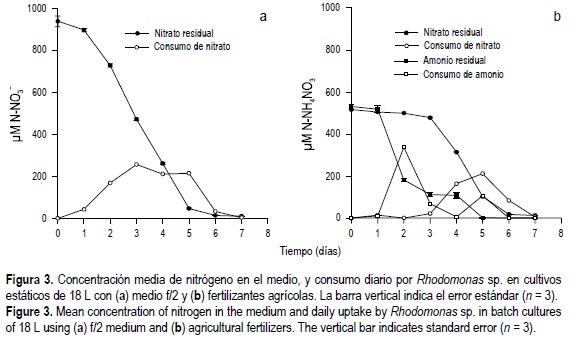 En al nivel de 18 L se observó que, durante la fase de crecimiento exponencial, la densidad celular obtenida en medio con fertilizantes agrícolas fue significativamente mayor que con el medio f/2. Esto se tradujo en una tasa de crecimiento específica mayor en fase exponencial, lo cual se relaciona con el rápido consumo de amonio en el cultivo con fertilizantes (fig. 3b). Sin embargo, este efecto es parcial dado que la tasa media de crecimiento y el rendimiento final en biomasa de Rhodomonas sp. fue similar entre tratamientos (fig. 1). Este comportamiento en el crecimiento, cuando el nitrógeno está disponible en forma de nitrato de amonio, ha sido observado también en otras especies de microalgas como en Dunaliella tertiolecta (Syrett, 1981) y en el clon T-ISO de Isochrysis aff. galbana (Valenzuela-Espinoza et al., 1999).