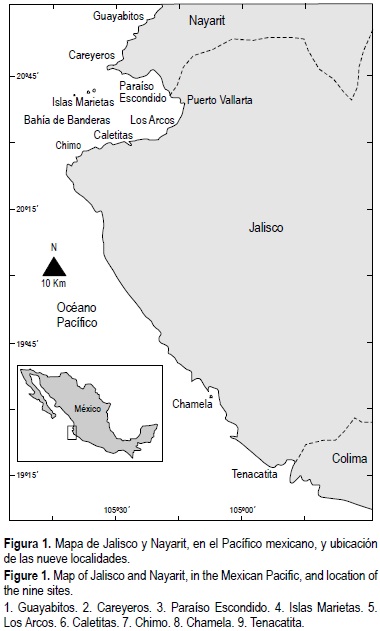 Hasta antes del evento El Niño 1997-98 los arrecifes coralinos de Jalisco y Nayarit, en el Pacífico mexicano (fig. 1), se caracterizaban por la dominancia de colonias ramificadas del género Pocillopora Lamarck 1816, con algunas colonias pequeñas de corales masivos e incrustantes de los géneros Porites Link, 1807 y Pavona Lamarck, 1801 (Carriquiry y Reyes-Bonilla, 1997; Cupul-Magaña et al., 2000; Medina-Rosas y Cupul-Magaña, 2001-2002). En junio de 1997 inició el mayor aumento anormal en la temperatura superficial del agua que se había registrado en las costas del Pacífico mexicano. Al final del verano, el calentamiento provocó la mortalidad masiva (96%) de los corales pétreos en varias localidades de esta región. Particularmente, las colonias de Pocillopora resultaron ser las más afectadas por el blanqueamiento y la mortalidad por este fenómeno (~100%). En contraste, las colonias de Porites sufrieron una mortalidad significativamente menor (~30%) (Carriquiry et al., 2001; Reyes-Bonilla et al., 2002).