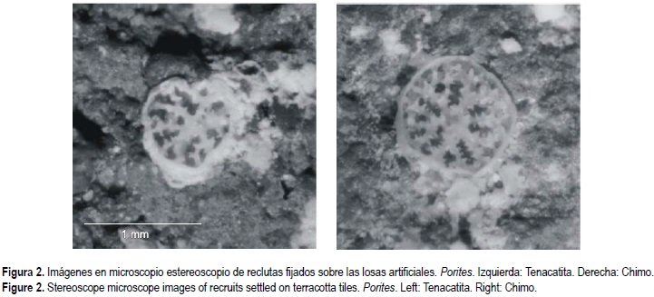 Se encontraron nueve reclutas (<1 mm; fig. 2) del género Porites fijados sobre losas en los arrecifes de Chimo (20°28' N, 105°36' W, al sur de Bahía de Banderas, Jalisco) y de Tenacatita (19°16' N, 104°52' W, localidad más al sur del área de estudio). No hubo diferencias estadísticas significativas en el número de reclutas hallados en los diferentes microhábitats (losas en sitio somero de Tenacatita; Mann-Whitney:α= 0.05, 15, 15, P > 0.3) y profundidades (Tenacatita; Mann-Whitney: α = 0.05, 11, 15, P > 1) en las localidades. Sin embargo, se encontraron diferencias significativas (Mann-Whitney:α= 0.05, 32, 26, P < 0.033) entre las localidades, probablemente debido a las características geomorfológicas (pendiente del fondo y tipo de fondo) y biológicas (cobertura y riqueza coralina) de cada una. La tasa de reclutamiento coralino fue de 1.08 corales m-2 en seis meses en Chimo (dos ejemplares en 32 losas) y 4.66 en Tenacatita (siete ejemplares en 26 losas).