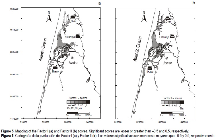 • The elements Cu, Co, Cd and Zn have a strong negative loading in Factor I (table 2). The corresponding mapping of the factor scores (fig. 5a) shows the influence of the industrial parks located close to Ovar and Estarreja (north of Aveiro).