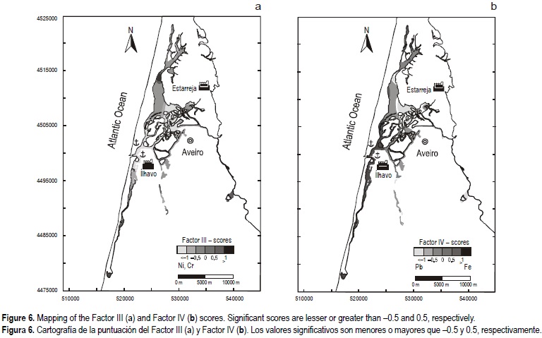 • Factor III explains the association between the Ni and Cr variables. The peculiar cartographic distribution of the factor scores (fig. 6a) suggests either a lithological/ mineralogical control (vermiculite and smectite rich muds) or some influence of different chemical parks surrounding the lagoon (Ovar, Estarreja and Ílhavo), pointing to the influence of the naval activities (port and shipyards) linked with Aveiro harbour.