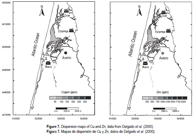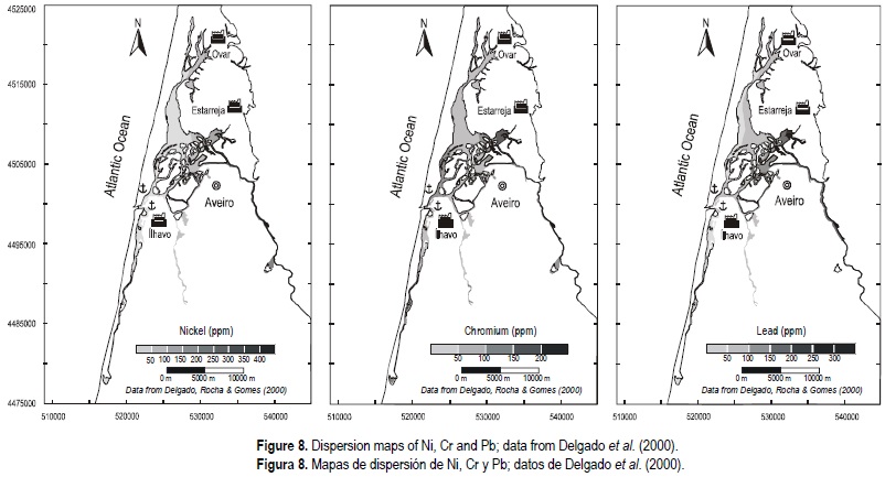 Mapping the sediment contents of Cu, Ni, Pb, Zn and Cr from the Aveiro Lagoon channels and comparing with those obtained in the 1980s by Delgado et al. (2000) (figs. 7, 8), we can conclude that Cu and Zn exhibit a tendency to disperse from the Ovar and Estarreja source areas and simultaneously to be more confined, with high contents in the north sector (near Ovar); Ni shows a dispersion, mainly from the Estarreja source area and from the Lower Vouga basin; Pb exhibits a slight tendency to disperse from the Estarreja source area and to a confinement in the central zone of the lagoon.