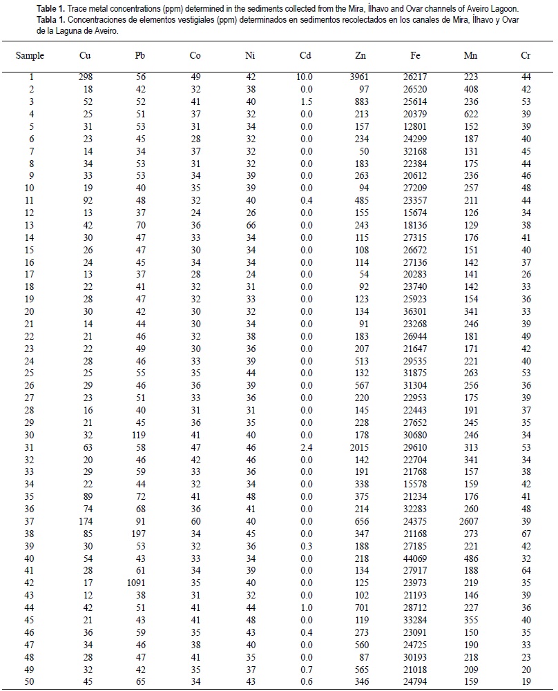 In the analysis of the chemical data (table 1), the nine variables (Cu, Pb, Co, Ni, Cd, Zn, Fe, Mn and Cr) were logarithmically transformed. This transformation allows a substantial decrease in the coefficient of variation, preventing subsequent estimation problems.