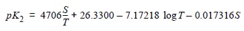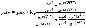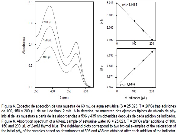 donde S es la salinidad y T la temperatura absoluta. Operando adecuadamente, se obtiene una expresión que permite el cálculo del pH a partir de las medidas experimentales de absorbancia a 596 y 435 nm, y de las absortividades molares (Robert-Baldo et al., 1985; Byrne, 1987; King y Kester, 1989; Clayton y Byrne, 1993; Zhang y Byrne, 1996):