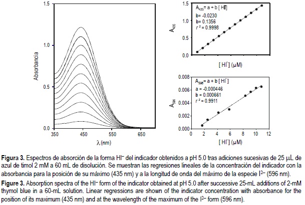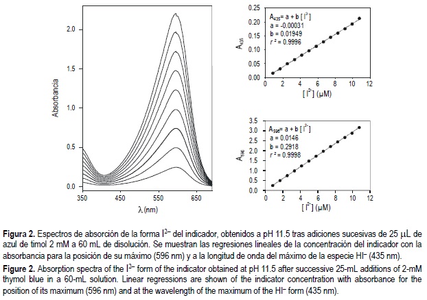 Puesto que los valores de la constante de disociación del azul de timol se han calculado tomando como referencia disoluciones de HCl Tris/Tris en agua de mar sintética, los valores de pHE son congruentes con los obtenidos potenciométricamente en la escala de la concentración total del ión hidrógeno. A diferencia de otros trabajos (e.g., Zhang y Byrne, 1996), las distintas absortividades molares, λε (HnI(2-n)-), se han obtenido a partir de adiciones sucesivas de indicador. En la figura 2 se muestran los espectros de absorción obtenidos para distintas adiciones de azul de timol a pHT de 11.5. Puede observarse la existencia de un máximo bien definido a 596 nm correspondiente a la especie I2- del indicador. Asimismo, existe una elevada linealidad entre los datos de absorbancia a esta longitud de onda y la concentración del indicador en su forma I2-, de cuya pendiente puede calcularse 596ε (I2-). El espectro de absorción presenta una banda ancha, de forma que la absorbancia residual a la longitud de onda del máximo de absorbancia de la especie HI- no es despreciable. Con objeto de corregir este efecto, es necesario calcular el coeficiente de extinción molar de la especie I2- a 435 nm por regresión lineal de la absorbancia a esta longitud de onda y la concentración de I2-.