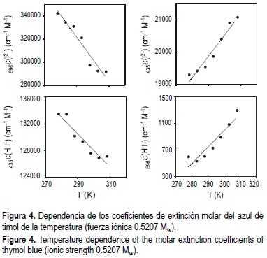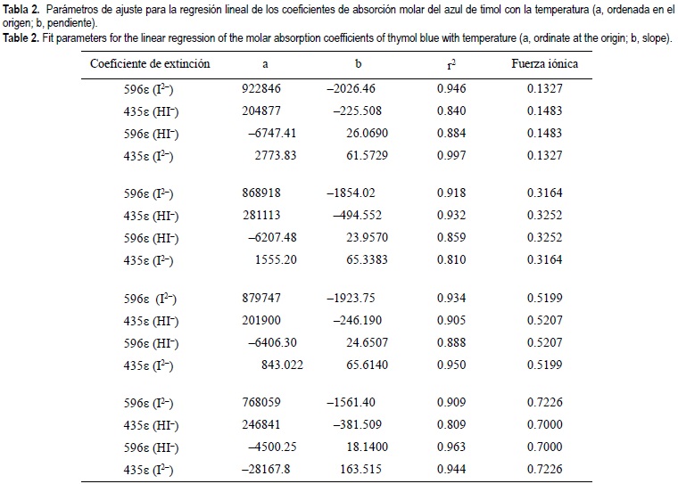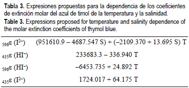 En la tabla 3 se recogen las expresiones propuestas para las absortividades molares del azul de timol en función de la temperatura y salinidad. Para aquellas absortividades molares que no presentan tendencias definidas con la salinidad, se ha incluido el valor medio de las distintas fuerzas iónicas ensayadas.