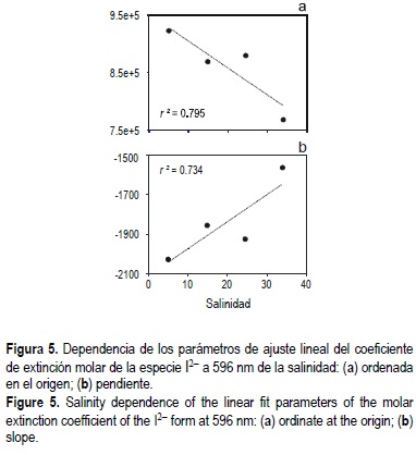 Para la base de datos completa, no se ha observado una tendencia bien marcada de las absortividades molares con la fuerza iónica. Solamente se ha apreciado una variación con la salinidad en 596ε (I2-). En este caso, los parámetros de ajuste con la temperatura muestran a su vez una dependencia lineal con la fuerza iónica (fig. 5).