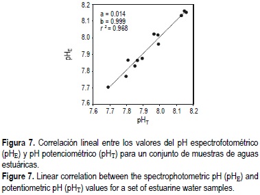 La medida del pH espectrofotométrico puede considerarse una técnica precisa y sujeta a un menor número de inconvenientes para la medida del pH en aguas oceánicas que las técnicas potenciométricas (Culberson, 1981; Dickson, 1993; Clayton et al., 1995; Murphy, 1996; French et al., 2002). No obstante, existen pocos estudios que hayan abordado la influencia de la salinidad sobre las absortividades molares y/o la constante de disociación del azul de timol en aguas estuáricas.