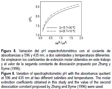 El método puede considerarse relativamente preciso (±0.0005 unidades), pero se han obtenido diferencias apreciables con los valores de pHT, sobre todo a bajas salinidades y pH inferiores a 8. En la figura 7 se observa como existe una cierta dispersión de los datos en torno a la recta de regresión entre las dos formas de medir experimentalmente el pH, en parte debida a la menor precisión de las medidas de pHT. En este sentido, debe considerarse que la medida del pH en la escala total del ión hidrógeno se realiza después de calibrar los electrodos con una disolución de fuerza iónica muy próxima al agua de mar. Por otra parte, sólo se conoce la dependencia de la segunda constante del azul de timol en el intervalo de 30 a 40 de salinidad (Zhang y Byrne, 1996). Aunque de la expresión propuesta por estos autores puede deducirse que el efecto de la temperatura es del orden de diez veces más importante que el de la salinidad para un intervalo de variación similar, esta tendencia no ha sido comprobada experimentalmente para salinidades bajas. En la figura 8 se muestra, para distintas condiciones de salinidad y temperatura, la variación del pHE con la relación 596A/435A, que constituye la variable experimental. Puede observarse cómo la utilización de indicador es especialmente recomendable para pHs relativamente elevados, próximos o superiores a 8. A pHs menores, existen cambios importantes del pHE cuando varía la relación entre las absorbancias en los máximos.