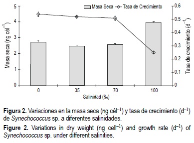 La mayor masa seca fue obtenida en los cultivos a 100% y con diferencias significativas (P < 0.05; fig. 2). El efecto de elevadas salinidades sobre la masa seca se ha reportado en Synechococcus sp., aislada de las salinas de Araya, Venezuela; con un incremento del volumen celular y disminución de la tasa de crecimiento con una concentración de NaCl de hasta 175% (Díaz y Reyes, 1990, 1992).