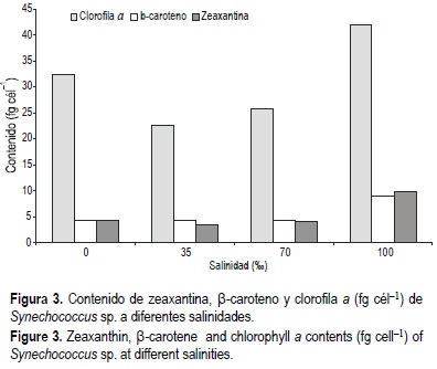 La salinidad a 100% también produjo los mayores contenidos de pigmentos con 41.9 ± 0.39, 9.0 ± 0.15 y 9.7 ± 0.24 fg cél-1 para clorofila a, β-caroteno y zeaxantina, respectivamente, y con diferencias significativas (P < 0.05), en relación con las otras salinidades (fig. 3). El aumento de la síntesis de carotenoides a esta salinidad, reflejada en la relación clorofila a/carotenoides, disminuyó de 3.74 a 2.20 entre 0% y 100‰.