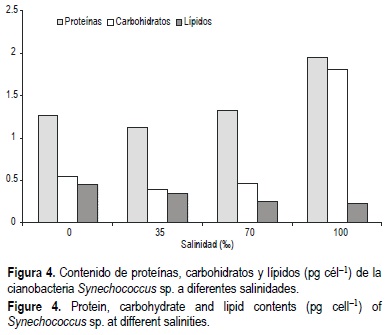 Los mayores valores de proteínas y carbohidratos se produjeron a 100% con 2.0 ± 0.05 y 1.8 ± 0.05 pg cél-1 (fig. 4), lo que sugiere un cambio metabólico en las células cuando se cultivan a altas salinidades. El aumento de la salinidad de 29% a 117% en Cyanothece 16Som2, reduce la producción de proteínas y carbohidratos (De Philippis et al., 1993). Sin embargo, en Aphanothece sp. el aumento de la salinidad produce un aumento de la producción proteica, tanto celular como por volumen de cultivo (Berland et al., 1989).