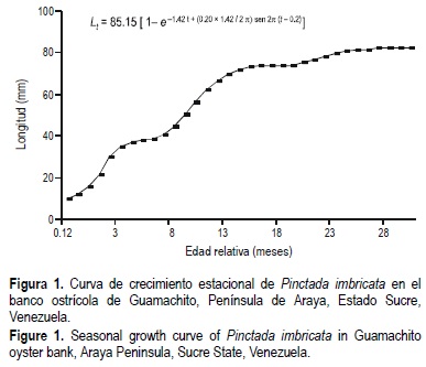 La estimación de los parámetros de la ecuación de crecimiento de P. imbricata en el banco de Guamachito sugiere que la especie es de rápido crecimiento con una longevidad máxima teórica de 3 años. Los ajustes obtenidos por los métodos de Gulland y Holt (1959) y Fabens (1965), fueron muy semejantes, con valores de 85.5 mm y 87.27 mm respectivamente, difiriendo de los 72.18 mm obtenidos por Munro y Pauly (1983). Así, los mejores ajustes para la ecuación del crecimiento con estacionalidad fueron: L∞ = 85,15 mm, K = 1.42 año-1; C = 0,20; WP = 0.42; ts= 0.2 y Rn = 1.39. La expresión final del modelo estacional (fig. 1) está representada por la ecuación: