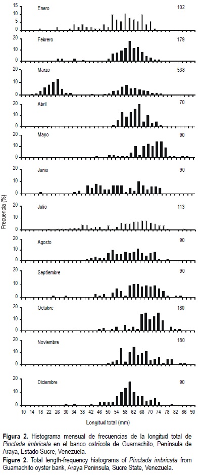 La distribución general de frecuencias de tallas fue bimodal, lo que indica que los reclutas se agregan estacionalmente a la población. Esto contrasta con la distribución unimodal reportada para una población de la Guajira colombiana (Urban, 2000). La presencia de distribuciones de tallas multimodales puede considerarse normal para una especie con una estrategia de reproducción sincrónica y varios desoves anuales provenientes de individuos con diferentes edades, como se ha informado para P margaritifera de la Polinesia francesa (Pouvreau et al., 2000).