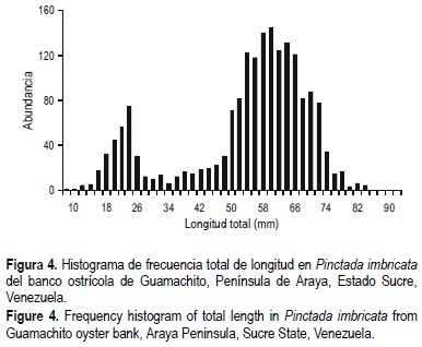 El promedio de talla encontrado en el banco ostrícola de Guamachito para P. imbricata (55.8 mm), es similar al reportado por Marcano (2001), para organismos de la Cabecera de la Isla Cubagua, Estado Nueva Esparta, Venezuela (55.32 mm). En consistencia con este criterio, la talla mínima comercial de extracción de 50 mm es adecuada, considerando además que la porción explotable del total de las ostras es la constituida por animales de talla superior a la sugerida, y que en este banco esa porción constituye 79.6% de la población. En el Mar Caribe colombiano, Borrero et al. (1996) señalan para esta especie una talla mínima comercial de 50 mm Lt.