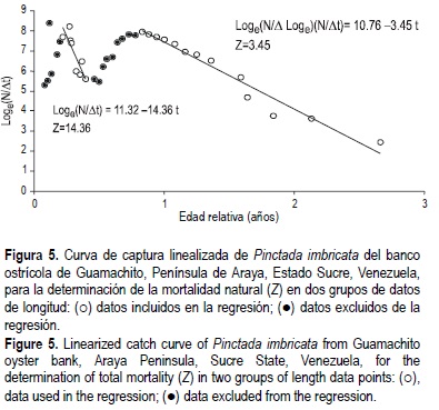 La mortalidad total de la población se estimó utilizando el método de la curva de captura linearizada, con tallas convertidas a edades (Pauly, 1983), según la expresión loge (N/Δt) = a-bt, donde -b = Z es la tasa instantánea de mortalidad total.