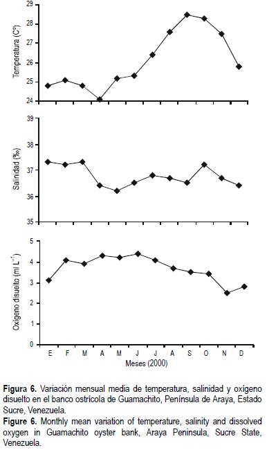 La temperatura del agua varió entre 24.8°C (abril de 2000) y 28.5°C (septiembre de 2000), con una media de 25°C ± 0.12 (fig. 6). La salinidad tuvo escasa variación, con valores entre 36.2% (mayo de 2000) y 37.3% (enero de 2000). La concentración del oxígeno disuelto presentó un patrón irregular, con valores bajos de noviembre a diciembre de 2000 y valores altos de abril a julio de 2000 (fig. 6).