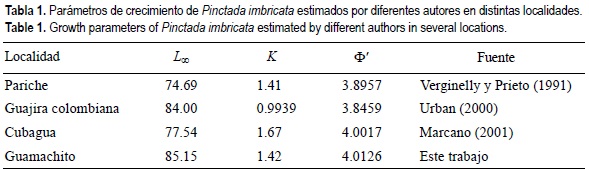 Se compararon diferentes curvas de crecimiento de P. imbricata estimadas en otros estudios y en diferentes localidades, utilizando el parámetro (Φ') Phi prima (Munro y Pauly, 1983; Pauly y Munro, 1984). Esta prueba sugiere que el desarrollo del crecimiento está reflejado por (Φ') = log10 K + 2log10 L∞ y los resultados indican que los valores de Φ' son muy similares (tabla 1).