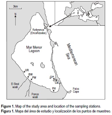Our results indicated that sediments from the southern basin of the Mar Menor coastal lagoon are influenced by historical mining activities developed in the adjacent mountains and show high levels of metals. Sediments influenced by the discharge of mining residuals through both wadis (BW and PW) presented metal bioavailability to benthic invertebrates (toxicity bioassays) and to marine phanerogams (bioaccumulation). The highest sediment metal concentration and toxicity levels were found in samples taken near the mouth of Beal wadi (BW), where mining wastes were discharged directly during mine exploitation. At present, due to the arid climate of the area, when torrential rains occur the mining wastes remaining in the mountains are introduced into the lagoon through the Beal (BW) and Ponce (PW) wadis. Small and not well-defined streams also occur that produce diffuse contamination around station UR.