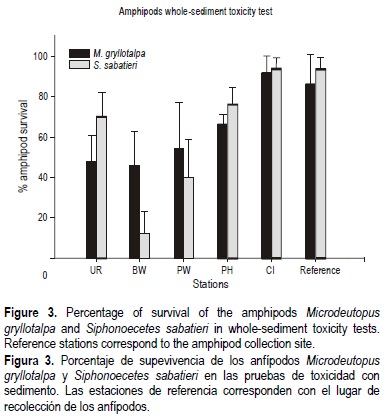 Whole-sediment bioassays with both species of amphipods showed similar toxicity patterns to those obtained with equino-derm embryo-larval bioassays. All stations, except for El Ciervo Island (CI), presented significant differences (Dunnet's test, P < 0.05) from the reference for both species of amphi-pods. For M. gryllotalpa, the mean percentage of amphipod mortality during the 10-day amphipod toxicity test ranged from 2-8% in the reference and CI stations to 46-54% at stations PW and BW (fig. 3). For S. sabatieri, the maximum percentage of amphipod mortality (88%) was observed at station BW. The effect concentration (EC50) mean value for the 48-h water-only reference toxicant tests with sodium dodecyl sulfide was 2.98 mg L-1 (±SD 0.26) for M. gryllotalpa, similar to that found by other authors (Cesar et al., 2000, 2002) and to that obtained for S. sabatieri, which presented a mean EC50 value of 3.10 mg L-1 (±SD 0.09).