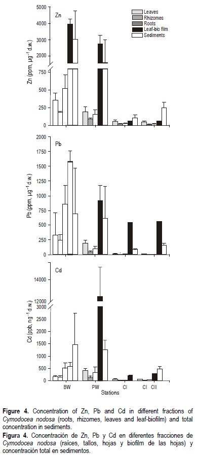 Cymodocea nodosa plants collected from the Mar Menor lagoon contained Zn, Pb and Cd, indicating their bioavailabil-ity to rooted aquatic plants. The metal concentrations in roots, rhizomes, leaves and leaf-biofilm are represented together with total sediment metal concentrations (fig. 4). There were significant differences (Dunnet's test, P < 0.05) in each plant fraction metal concentration between sampling stations. Stations BW and PW located at the outlets of both desert streams presented the highest metal contents in sediments and in the different plant fractions analyzed, the former being the station that showed the highest concentrations. Both reference stations (CI and CII) presented similar metal concentrations in the different plant fractions analyzed. Except for station BW, where the Pb concentration was higher in roots than in the surrounding sediment, the metal concentrations determined in the sediments were higher than in the plant fractions (leaves, rhizomes and roots) for the three metals determined. The highest metal concentrations in plants from polluted stations were found in the leaf biofilm (3913 ± 326 µg Zn/g d.w. and 1568 ± 191 mg Pb/g d.w. for station BW, and 12489 ± 2592 ng Cd/g d.w. for station PW), possibly due to its ability to form complexes between metals and the extracellular polymeric substances that form the biofilm.