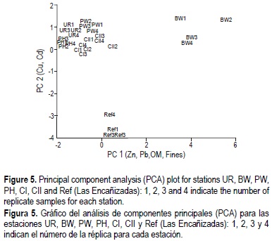 The two-dimensional PCA plot is represented in figure 5, with the stations ordered along the first axis, according to Zn and Pb concentrations and organic matter and fine sediment content. All the samples from BW had PC1 scores greater than 3.5, suggesting that they are severely contaminated by Zn and Pb; they also presented a high content of fine-grained sediment and organic matter. Stations CI and CII presented PC1 and PC2 values close to 0, indicating low or moderate levels of metals; however, stations BW, PW and UR, with PC2 scores of between 1 and 2, had moderate contamination levels of Cu and Cd. The results of the PCA analysis are in accordance with those obtained in the MDS ordination.