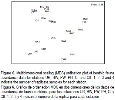 The two-dimensional MDS ordination (fig. 6), based on invertebrate community composition, produced three groups of sites (Bray Curtis similarity between groups of approximately 45%). One group contained the stations CI, CII and PH, within which replicates were consistently grouped, except replicate CII3 plotted outside the group. Another group included the four replicates of station UR, and a third group consisted of the two flood-way stations (BW and PW), whose replicates were mixed and dispersed to the right side of the plot, presenting the highest variability among replicates.