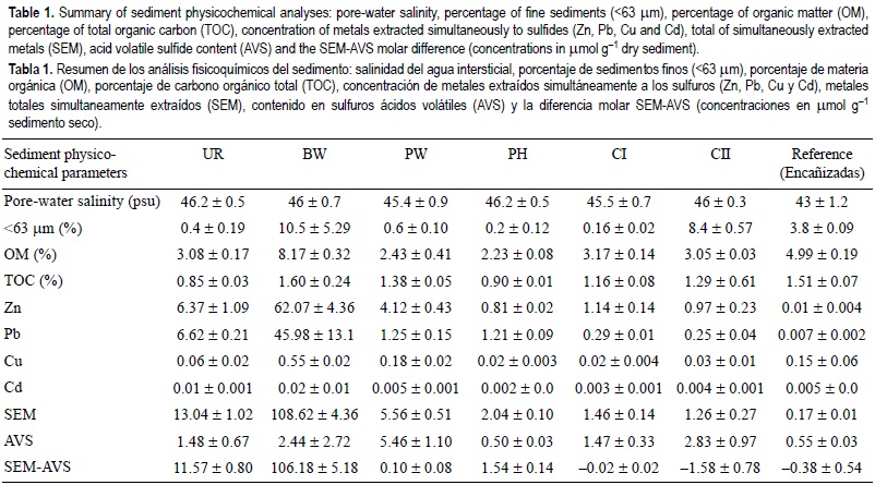 Station BW presented the highest sediment metal values for the metals analyzed simultaneously to sulfides, whereas the highest AVS concentration was observed at station PW. The SEM-AVS relation was positive at PH, UR, PW and BW, being highest in the last station. Negative values were found at CI, CII and the reference station.