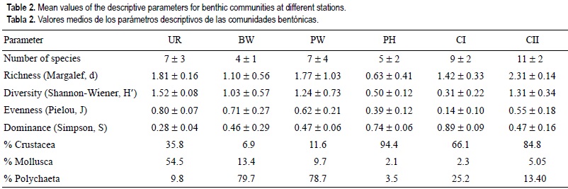 The results of the descriptive analyses are shown in table 2, together with the numerical contribution of the major taxo-nomic groups. Polychaetes dominated at the stations affected by the discharge of the desert streams (BW and PW), while crustaceans predominated at those stations furthest from the wadis (CI, CII and PH). The amphipod S. sabatieri presented the highest abundance. Other less abundant organisms were the Cirratulidae polychaetes, the bivalves Cerastoderma edule and Mytilaster minimus, and the isopod Sphaeroma serratum.