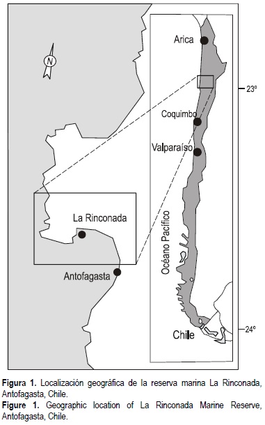 El área de estudio está localizada en el sector de La Rinconada de la Bahía de Antofagasta, ubicado en 23°28' S y 70°30' O, 20 km al norte de la ciudad de Antofagasta, Chile (fig. 1). Un estudio reciente llevado a cabo por Avendaño et al. (2004) ha demostrado que el área de la reserva marina está sujeta a flujos alternados de corriente que resultan de una corriente predominante hacia el norte que se encuentra con la barrera impuesta por la playa, reflejándose en forma cíclica en escalas de tiempo diarias. Esto produce intercambio y mezcla de masas de aguas y la retención de material particulado en suspensión, incluyendo larvas de A. purpuratus, en un área de 5 km de radio (Cantillánez, 2000; Avendaño et al., 2004).