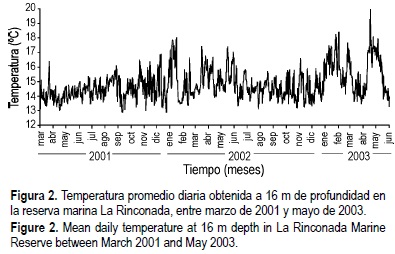 Esta bahía se caracteriza, además, por la existencia de zonas de surgencia de aguas frías que permiten la incorporación regular de nutrientes a las aguas superficiales durante gran parte del año (Guillen, 1983; Rodríguez et al., 1991; Marín et al., 1993; Escribano et al., 1995; Cantillánez et al., 2001). La incorporación de estos nutrientes en las aguas superficiales permiten el desarrollo de florecimientos fitoplanctónicos a lo largo de todo el año, con concentraciones de clorofila a que fluctúan de 1-12 ng L-1, superando en ocasiones los 20 ng L-1. El estudio de la composición específica de los florecimientos muestra que las diatomeas dominan sobre los flagelados y que los dinoflagelados tóxicos son poco abundantes (Avendaño et al. , 2004). La temperatura media diaria del agua de la bahía en años con ausencia de Niño o Niña, oscila en el fondo (16 m de profundidad) entre 13°C y 19°C, registrándose los promedios más altos durante los meses de verano (Cantillánez, 2000; Avendaño et al., 2004). Los promedios diarios de temperatura, obtenidos a través de mediciones continuas cada 6 h entre marzo de 2001 y mayo de 2003, realizadas con ayuda de un termógrafo electrónico instalado a 16 m de profundidad, se muestran en la figura 2.