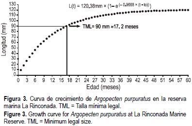 Stotz y González (1997) señalaron parámetros de crecimiento similares a los obtenidos para A. purpuratus en la reserva de La Rinconada (L∞ = 120.19 mm; K = 0.9666) en una población de Puerto Aldea (Coquimbo, Chile). Esos autores indican una L∞ = 124.6 mm y un K = 0.84, lo que permite estimar que los individuos en dicha localidad alcanzarían la talla comercial (90 mm) en 18 meses, mientras que en La Rinconada lo harían a los 17.2 meses. Otros resultados para la región de Coquimbo sugieren un periodo de crecimiento de 27 ó 28 meses hasta alcanzar la talla comercial, basado en un valor de L∞ = 112 mm y K = 0.52 (Etchepare y Videla, 1989). Estos resultados indican un crecimiento más rápido conforme disminuye la latitud dentro de Chile, aunque resultados obtenidos en La Pampa, Tunga y Bahía Independencia, en Perú, indican que los ostiones podrían alcanzar la talla de 90 mm sólo después de 39 a 51 meses, con un L∞ que varía entre 106 y 109 mm, y con valores de K entre 0.43 y 0.52 (Yamashiro y Mendo, 1988). En contraste, Wolf (1987) determinó una L∞ = 112 mm y un K = 2.10 para esta especie en Bahía Paracas, Perú, bajo condiciones de El Niño ocurrido en 1983, indicando que la talla de 90 mm bajo estas condiciones de agua cálidas se alcanzaría entre 12 y 13 meses.