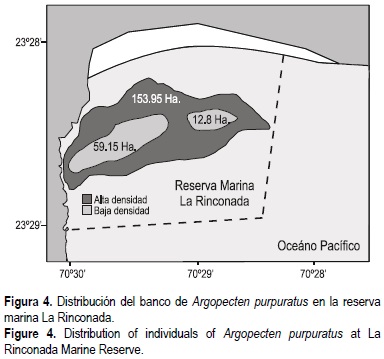 Los resultados obtenidos a través de las evaluaciones realizadas en la reserva entre 2001 y 2003 permiten señalar que el banco de A. purpuratus de La Rinconada se distribuyó en una sola área cuya superficie alcanzó 254.8 ha en 2001, 242.7 ha en 2002 y 225.9 ha en 2003, extendiéndose entre 23°28'13.5" S, 70°29'7.9" W y 23°28'38.2" S, 70°30'41.1" W, a profundidades entre 6 y 24 m. Dentro de estas áreas, los ejemplares se concentraron preferentemente en áreas de 50.4 ha en 2001, de 71.3 ha en 2002 y de 72.0 ha en 2003 entre profundidades de 7 y 17 m (fig. 4).
