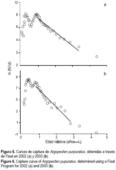 Los resultados obtenidos a través de este análisis (fig. 6a, b) señalan una mortalidad (Z) para 2002 de 2.15, sobre el segmento de la población entre 67.5 y 115.5 mm, y de 3.08 para 2003 sobre el segmento de 64.3 a 112.5 mm. Estos valores indican que la supervivencia alcanzó 11.5% en 2002 y 4.6% en 2003 para cada uno de los segmentos de la población señalados.