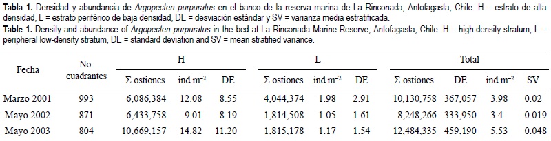 Una vez delimitada el área de distribución de los organismos se procedió a realizar un muestreo piloto (Avendaño y Cantillánez, 2003) para determinar el número mínimo de muestras. De este modo se establecieron 26 estaciones de muestreo en 2001, 27 en 2002 y 19 en 2003, representando en cada ocasión cerca del 10% de la superficie total que ocupaba el banco en ese momento. En cada estación se muestreó diez veces un cuadrante de 1 m2 para obtener una densidad media por estación. Con los datos obtenidos se procedió a determinar el número mínimo de unidades de muestreo requeridas para estimar la densidad y abundancia total de la población de A. purpuratus, de acuerdo a la siguiente expresión (Thompson, 1992):
