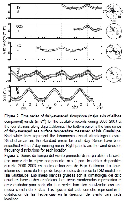 Data reveal generally equatorward winds (negative alongshore component) and a dominance of northwesterly (~315°) winds, strongest around May/June and weakest in January. Except for the SQ station (inland, fig. 2c), a relative maximum in intensity is also seen in October. At the ITS and SQ coastal stations (fig. 2a, c), large variability in the frequency distributions and the presence of winds in the cross-shore direction suggest the influence of the local topography and breezes. The amplitude of the seasonal mean is larger for the oceanic station (~2 m-1 at IG, fig. 2d). The IG station presents the more intense and persistent winds, with high variability of alongshore wind speed around the seasonal mean. The ITS station shows the largest variability relative to SQ and BSQ, due to the diurnal breeze. Mean wind speed (table 1) is maximum at the oceanic station (IG) and minimum at the inland location (SQ). Anomalously weak winds signaling El Niño conditions were not recorded at any of the stations, except for events lasting two to three weeks at IG during winter (late 2002 and early 2003).