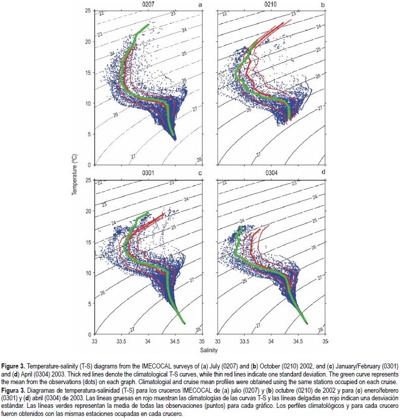 Temperature-salinity (T-S) diagrams are used here to illustrate the main thermohaline characteristics that prevailed during the surveys (fig. 3). In order to better visualize changes in the existing conditions, T-S data pairs are contrasted to cli-matological profiles (±1 standard deviation) for each season, computed from the 1950-1978 CalCOFI and the 1997-2003 IMECOCAL data. Mean temperature and salinity were computed over selected density ranges. Red and green thick curves depict the climatological and cruise means, respectively. Care was taken to compare T-S diagrams and the corresponding mean profiles for the same oceanic stations occupied during each cruise. Cruise mean curves (green) indicate that near normal conditions persisted during the summer of 2002 (fig. 3a), since data points for the 0207 cruise fall near the climatological mean. The exception for this cruise are warm surface waters (σt < 24), which are not observed in the climatological mean. Starting in October 2002 (fig. 3b), fresher than usual waters are observed for 24.5 <σt < 25, while in January (0301) and April (0304) near-surface waters were fresher than the mean profile for σt < 24.6 and σt < 25.5, respectively. Besides the difference in salinity, data from October 2002 (fig. 3b) also showed lower than seasonal mean surface temperatures (~2-3 °C). These last three cruises showed the presence of less saline water (S ~ 33) around the near-surface salinity minimum (σt ~25, 0-100 m). This minimum is associated with the CC core, a water mass of subarctic origin. The presence of this relative salinity minimum suggests that during these months, subarctic water entered the region through intensification of equatorward flows or larger spatial extension, or both, of the CC.