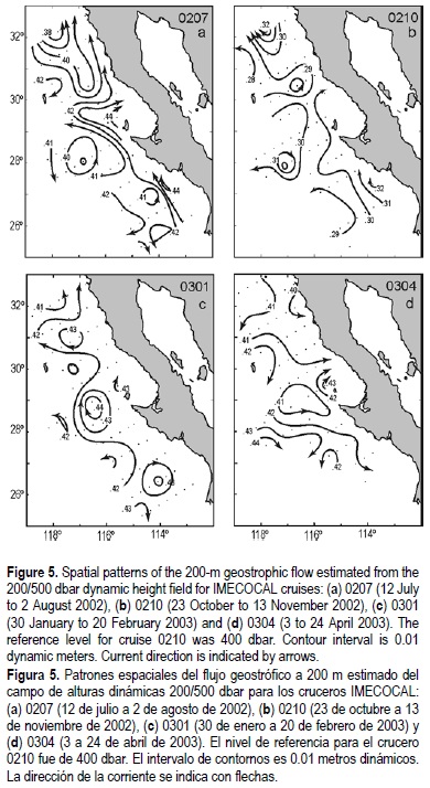 Near-surface dynamic heights depict in general an equator-ward flow with considerable mesoscale features (fig. 4a-d). There are indications of poleward flows only at selected coastal locations associated with coastal prominences and upwelling, or near the coast of Punta Eugenia during July 2002 when the northward flow is due to the presence of a cyclonic gyre centered around 200 km offshore. Thus, the expected northward flow carrying waters from the south, as is usually seen for an El Niño event, was not present.