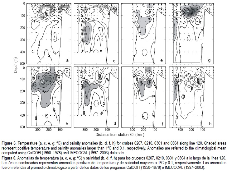 A measure of the changes induced by local and remote forcing during 2002-2003 are temperature and salinity anomaly fields for line 120 (fig. 6), a line that represents the locus of the greatest latitudinal variability of water properties within the CCS. Anomalies are referred to climatological means derived from 33 years of historical data (CalCOFI and IMECOCAL).