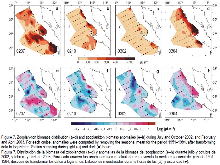 The July 2002 cruise (0207) exhibited high zooplankton biomass (100-500 µL m-3) over most of the survey area (fig. 7a), separated by two zonal bands of lower biomass (<100 µL m-3). In the Gulf of Ulloa (~24.5-26.5°N) even higher biomass was found (>500 m-3). Zooplankton biomass anomalies during cruise 0207 (logarithms, fig. 7e) were highly variable from one sampled station to another; however, a negative tendency was evident in the coastal zone off northern Baja California and a positive one in the central lines and the Gulf of Ulloa.